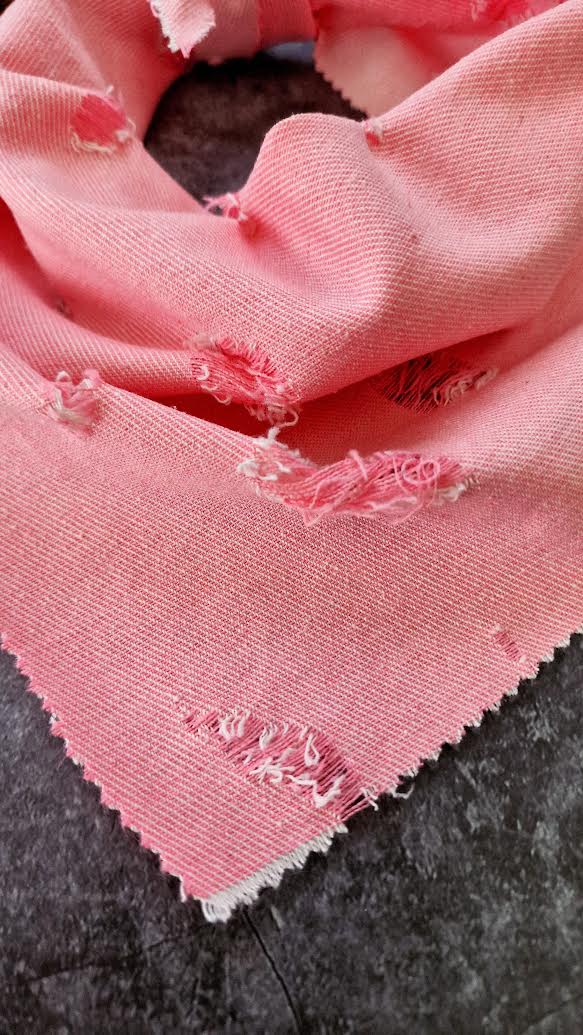 Our distressed denim bandanas have an unfinished raw, natural, organic edging to create a relaxed, rustic look. The edges have been intentionally roughened with scissors and left completely unsewn, giving each piece its own character and individuality (expect them to continue to fray with wear - loose threads will need trimming!)