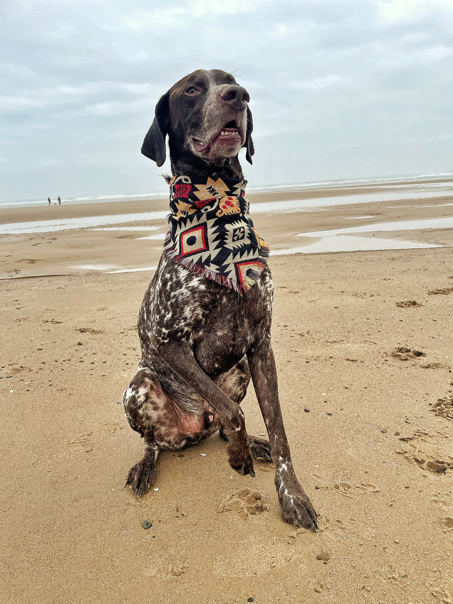 The exact same design, quality and method of fastening but with an added 'extender' each end to allow our Frayed Bandanas to fit the XL breeds!