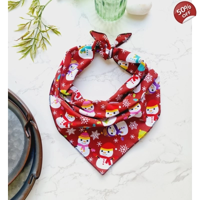 Jolly Snowmen in their matching wooly scarves, hats and mittens on a festive red fabric