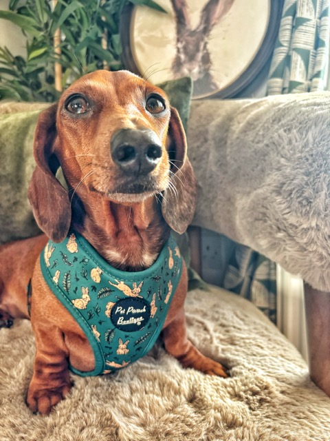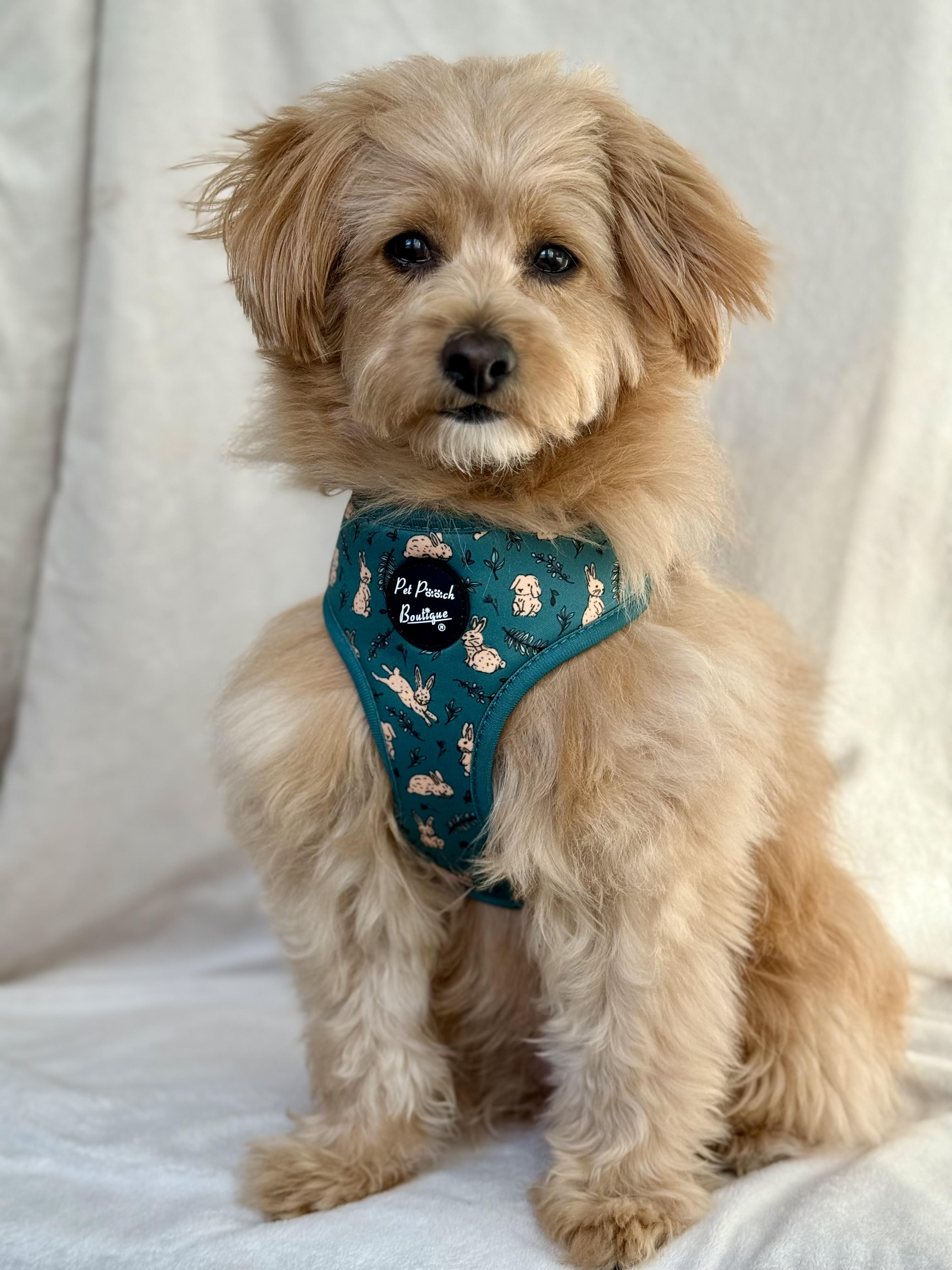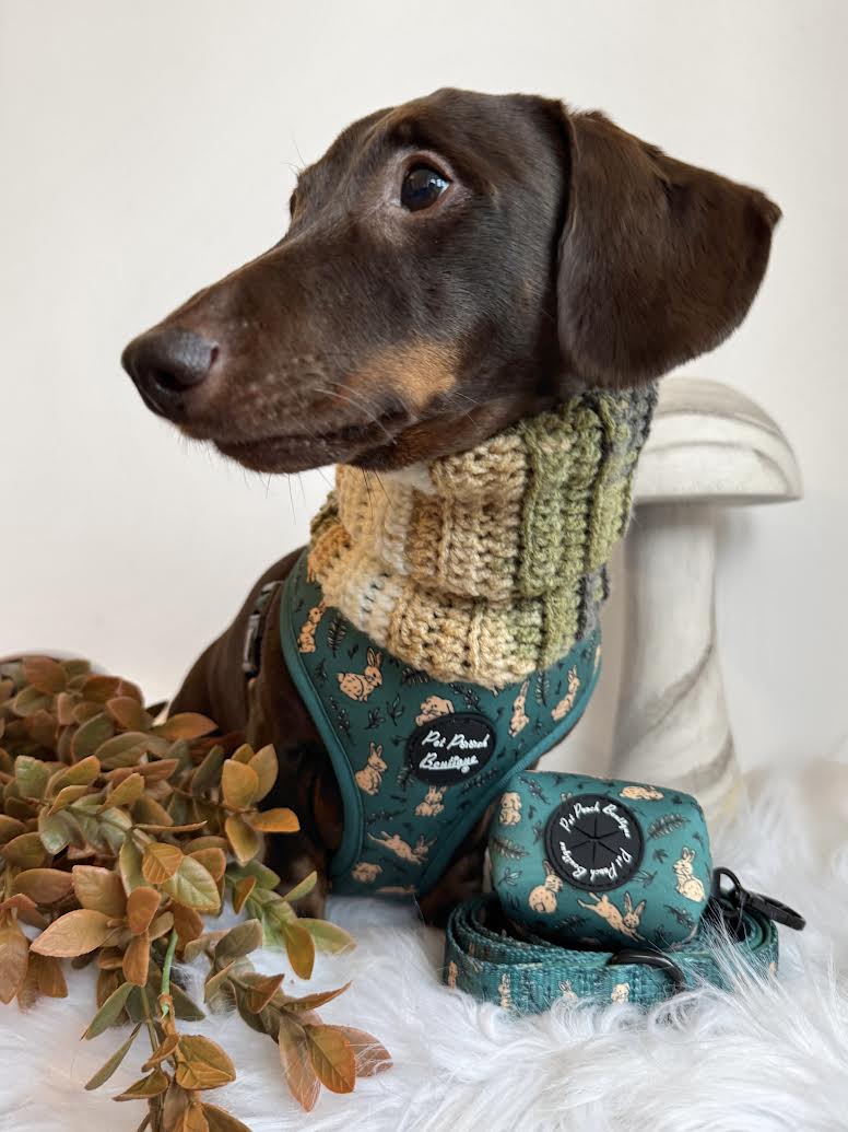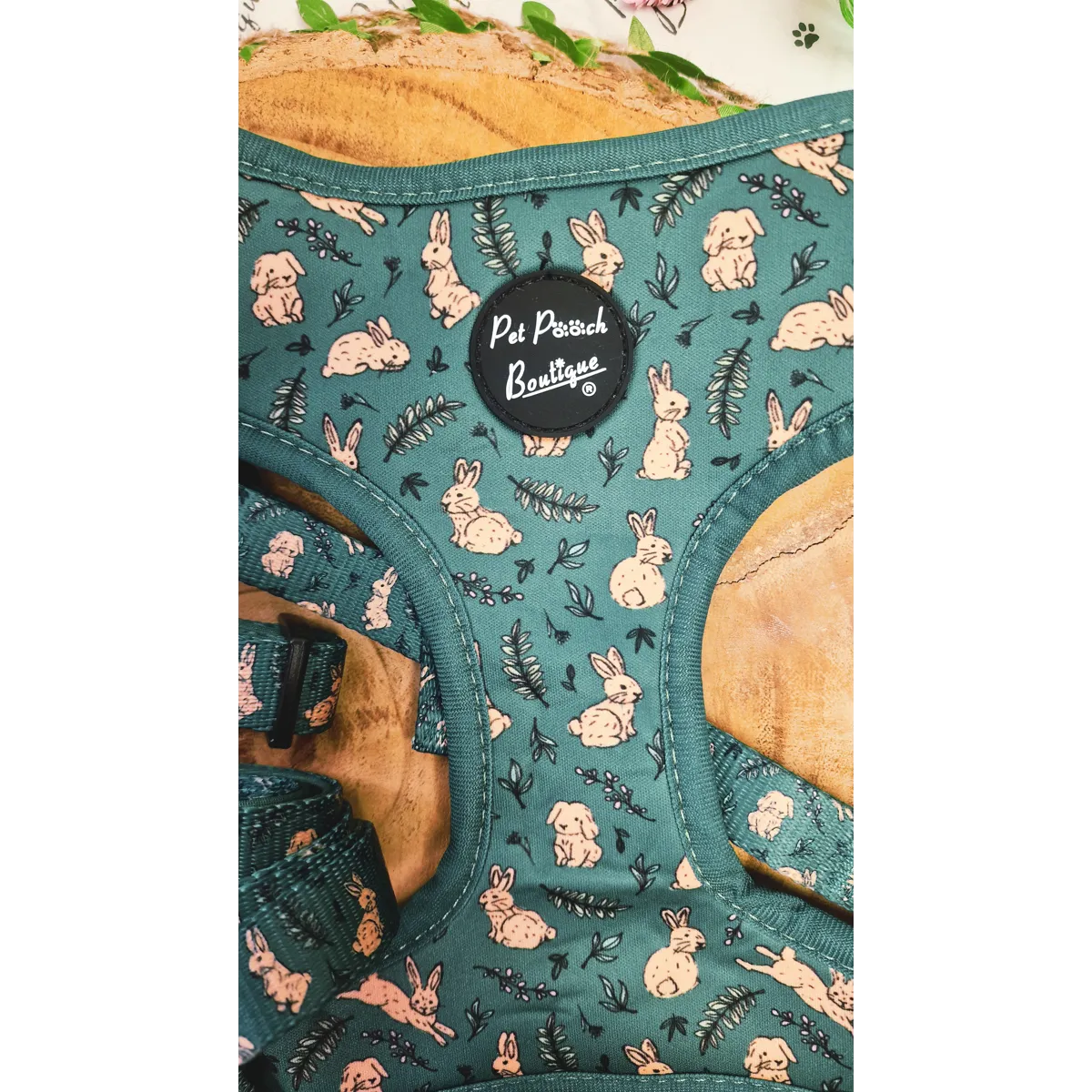 A hand drawn woodland inspired pattern featuring soft tan bunnies surrounded by leafy sprigs and wild meadow greens. Perfect for nature lovers and their furry friends, this design brings a countryside vibe to every walkies.